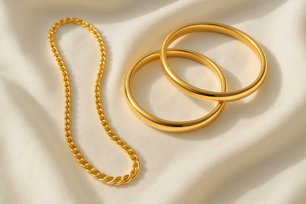 Meskipun lebih umum digunakan sebagai aksesori, perhiasan emas murni (dengan kadar tinggi seperti 22K atau 24K) juga bisa menjadi alternatif investasi, terutama jika dibeli dengan desain minimalis dan berat yang signifikan.