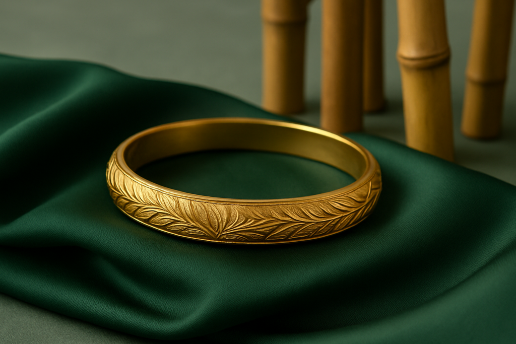 Cincin atau gelang emas yang terinspirasi dari daun, bunga, ataupun tekstur alami memberikan kesan elegan dan artistik.