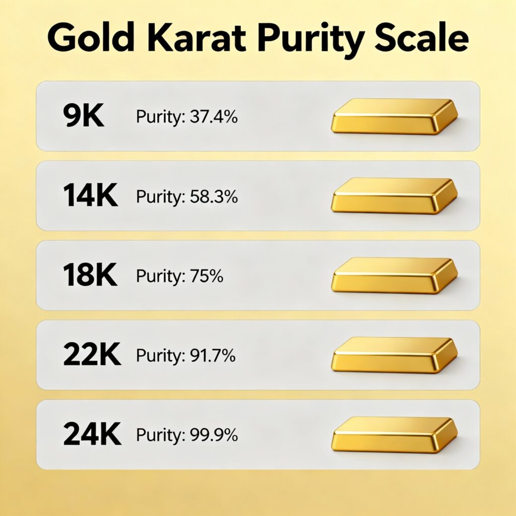 Standar karat yang umum di pasaran adalah 9K, 10K, 14K, 18K, 22K, dan 24K. Semakin tinggi karat, semakin banyak kandungan emas murni dan biasanya warnanya lebih jenuh. Namun, emas dengan karat lebih rendah cenderung lebih kuat karena kandungan logam paduan yang lebih tinggi.